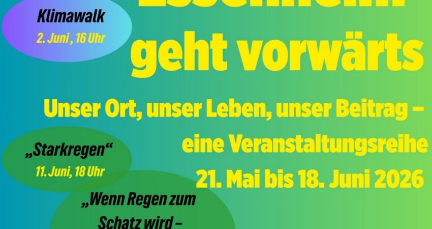 Starkregen wird zum Thema des Abends:Um 18 Uhr startet ein Rundgang durch Essenheim, um 19 Uhr folgt der Vortrag von Ronald Bahrt, Essenheim: „Wenn Regen zum Schatz wird – Das Schwammdorf-Prinzip für Essenheim“. Statt Wasser schnell abzuleiten, zeigt das Konzept neue Wege: speichern, versickern lassen, nutzen – für weniger Überflutung und mehr Klimaanpassung.