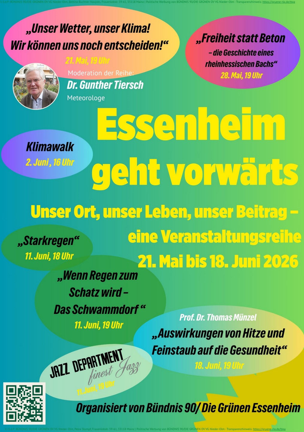 Die Veranstaltungsreihe wird organisiert von Bündnis 90/Die Grünen Essenheim. Alle Bürgerinnen und Bürger sind herzlich eingeladen, mitzudenken, mitzudiskutieren und die Zukunft ihres Ortes aktiv mitzugestalten.