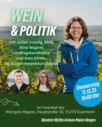 Vier Weine, eine Winzerin, ein Sommelier – und jede Menge grüne Politik. Julian Joswig, Mitglied der GRÜNEN Bundestagsfraktion und IHK-geprüfter Assistant-Sommelier und Nina Wagner, GRÜNE Landtagskandidatin und Winzerin aus Essenheim,…