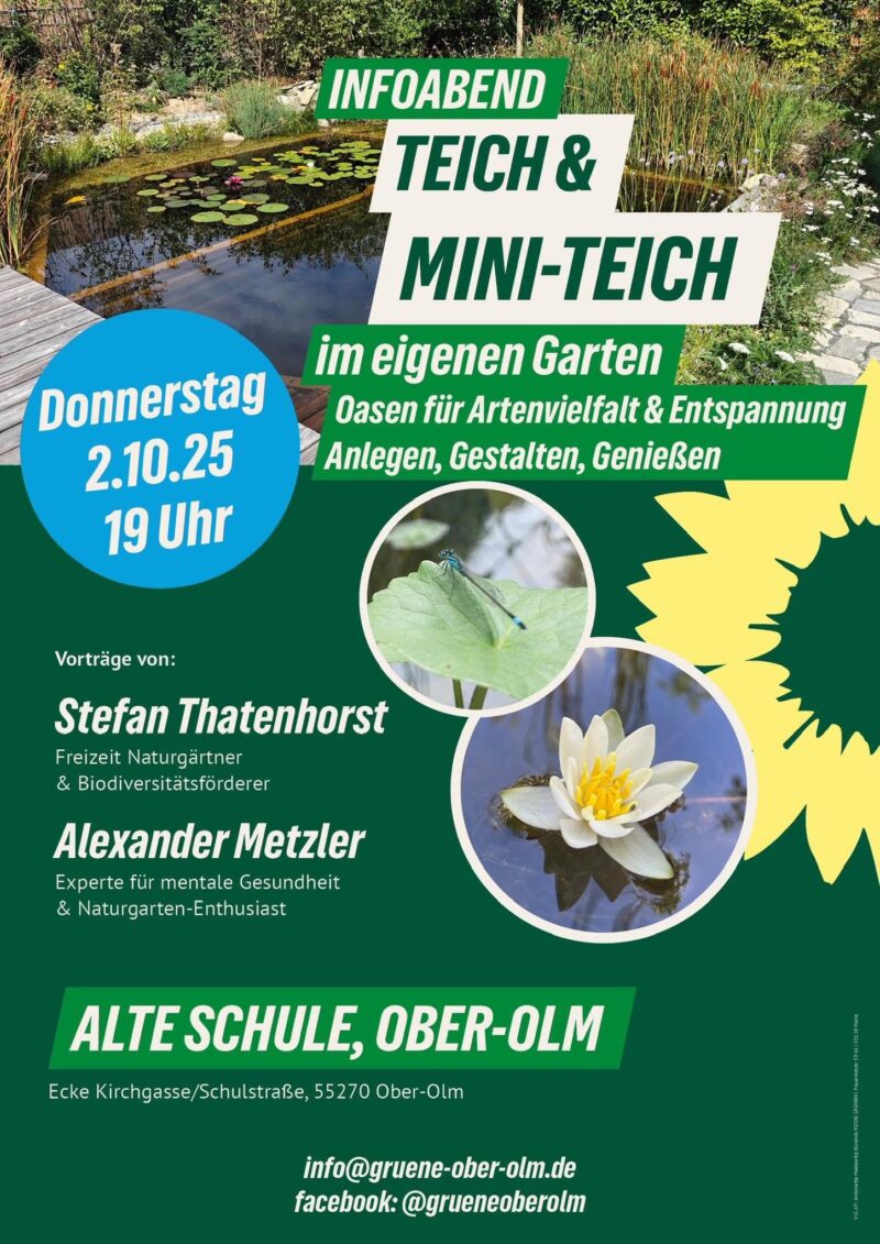 Gut besucht war am 2. Oktober 2025 die Veranstaltung der Ober-Olmer Grünen in der Alten Schule. Alexander Metzler und Stefan Thatenhorst berichteten über ihre jeweiligen Gartenteichprojekte und gaben den Zuhörern jede Menge Tipps und Tricks an die Hand. Ob kleiner Tümpel in einem ungenutzten Bereich des Gartens oder ein Großteich, der der Artenvielfalt zugute kommt und gleichzeitig Schwimmen ermöglicht – beides ist mit entsprechender Planung umsetzbar. Alexander Metzler und Stefan Thatenhorst nahmen die Anwesenden mit, motivierten zu eigenen Teichprojekten und beantworteten jede Menge Fragen.